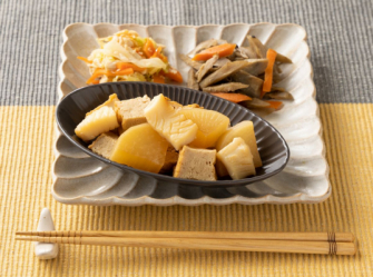 アカイカとは、他にムラサキイカとも呼ばれ、見た目はスルメイカに似ていますが、身が柔らかく、あっさりとした味わいで食べやすいのが特徴です。青森県でのイカ類漁業の中でもアカイカは重要な魚種で、以前は流し網漁業で行っていましたが、現在では、イカ釣り漁業で主に漁獲されています。今回は、青森県産アカイカを使ったメニューを秋冬限定で販売します。青森県産アカイカに、寒い時期にぴったりの大根と厚揚げとで煮物に仕上げました。素材に出汁がじっくりとしみ込んでいてほっこり出来る一品です。副菜には、主菜との栄養バランスを考え、ごぼう・人参・しめじ・ピーマン味噌炒めと、キャベツと蒸し鶏のサラダをセットにしています。副菜もそれぞれ60gとボリュームあって野菜をしっかり摂っていただけます。