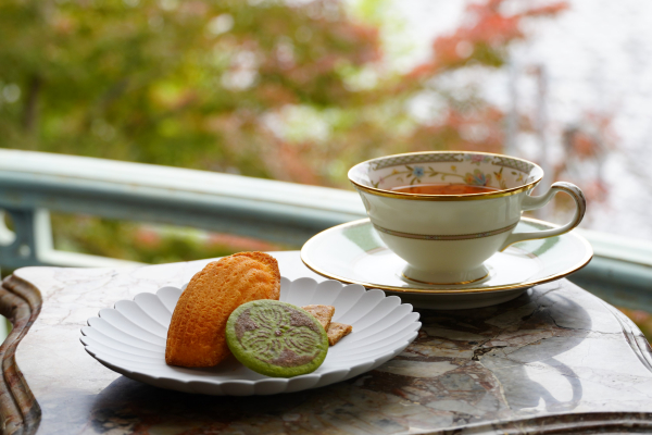 長楽館を創設した村井家の家紋「三柏」の模様の抹茶クッキー・マドレーヌ・ゴマサブレの焼菓子とドリンクがセットになったお得な115周年限定セットを期間中の平日数量限定で販売いたします。