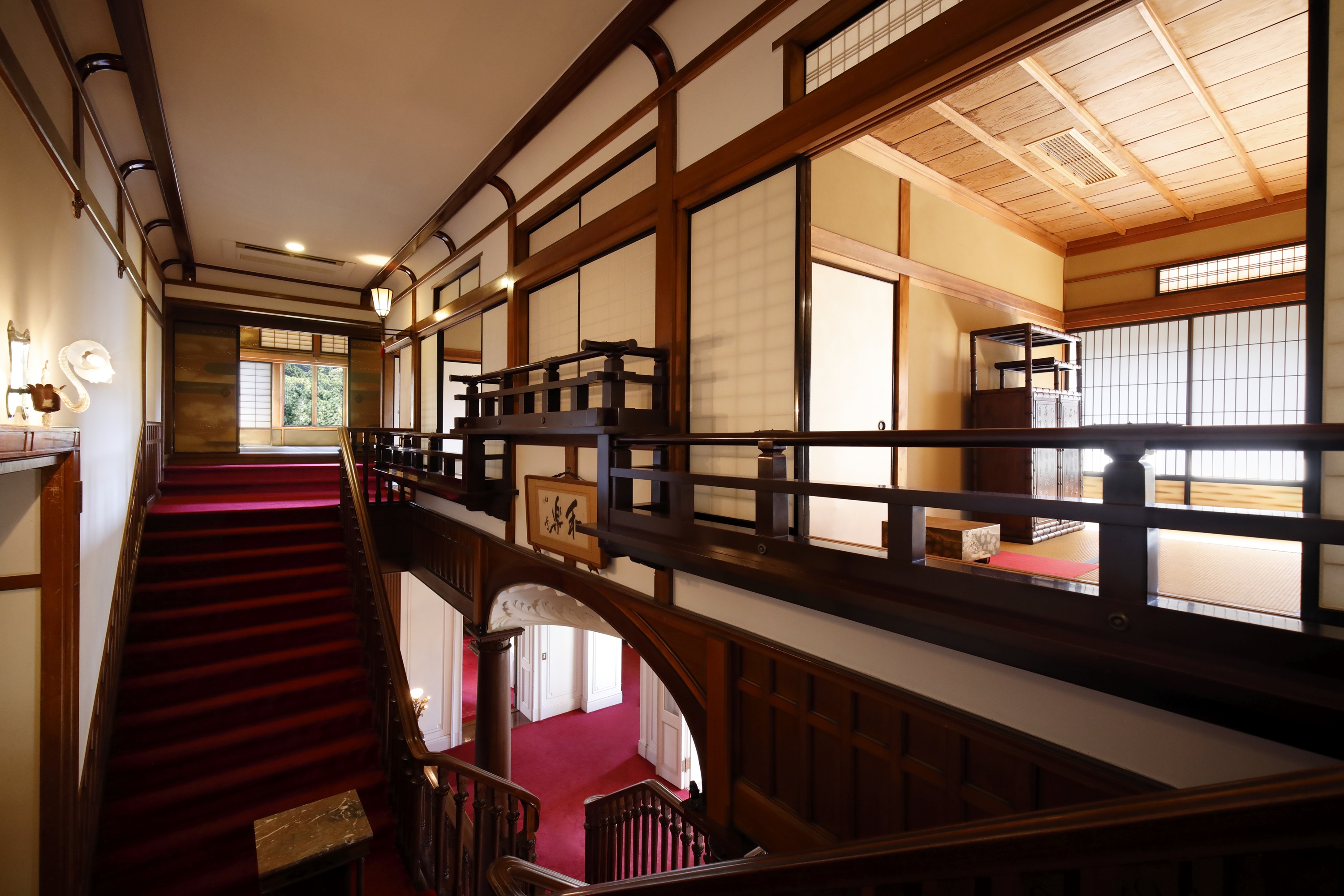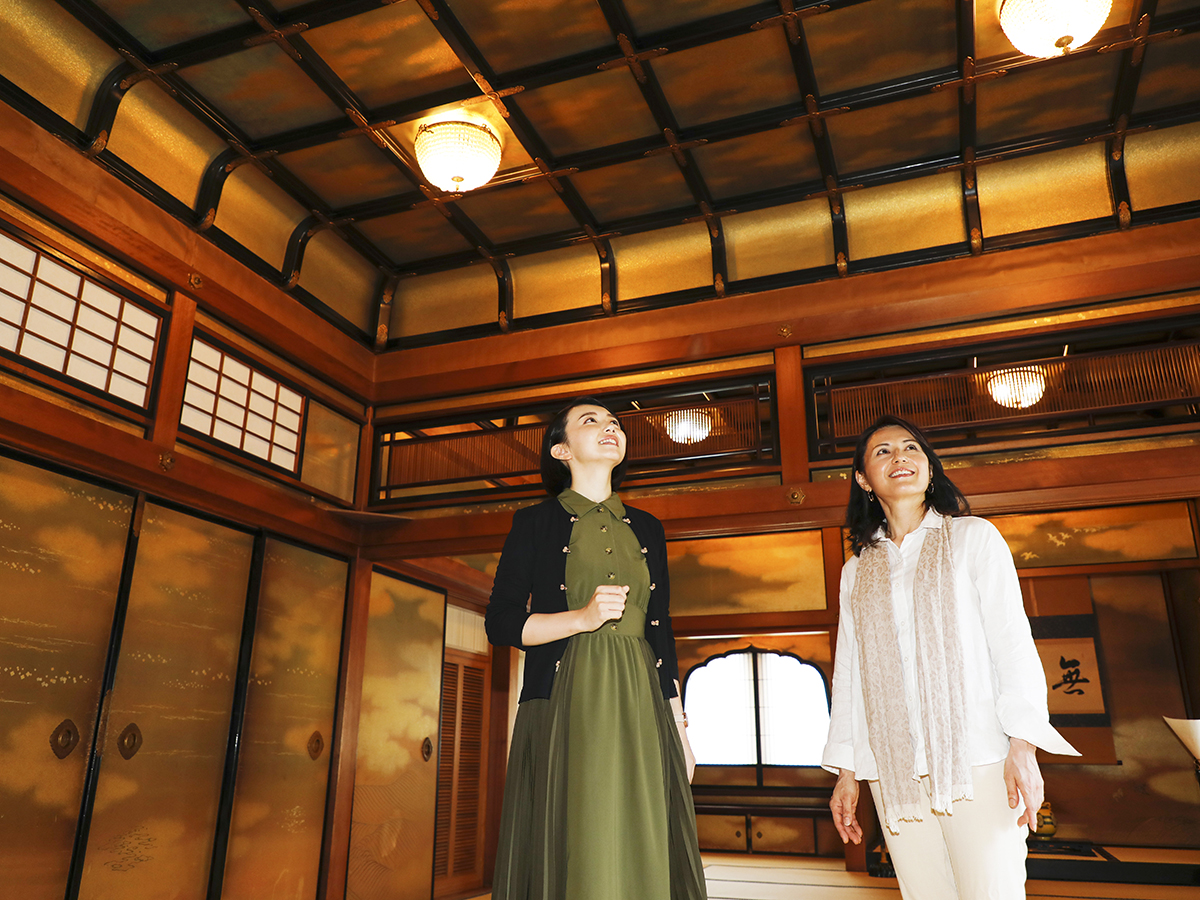 「御成の間」は折上格天井にフランスバカラ社製のシャンデリア、金地の障壁画が美しい書院造の和室です。「長楽庵」は表千家の残月亭の写しと伝わる茶室で、左右の丸型のステンドグラスが華やかさを添えています。いずれの部屋も、長楽館を訪れた国外の賓客に日本の文化を紹介する意図があったと考えられています。長楽館スタッフがご案内する、国の重要文化財に指定された京都のモダン建築の魅力をお楽しみいただきます。