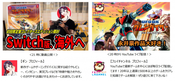Nintendo SwitchTM版『UFOロボ グレンダイザー:たとえ我が命つきるとも』の発売を記念して、ゲームの魅力を発信する2つの人気YouTubeチャンネルでの動画公開とYouTubeライブが配信されます。動画は21時に「ギン(@ginjogames)」さんのチャンネルで公開され、YouTubeライブは20時から「フェイチャンネル(@feichannel_game)」さんで配信されます。ゲームプレイに加え、「初回限定版コレクターズエディション」のご紹介もお楽しみください!
