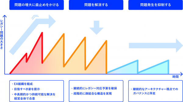 EA組織はレガシーシステム問題を、システムを「Future Ready」つまりビジネスや技術の変化に即応できる状態に維持する活動の一部として捉え、解決に取り組みます。そうすることで、システム全体の中長期コストとリスクの極小化を目指していきます。