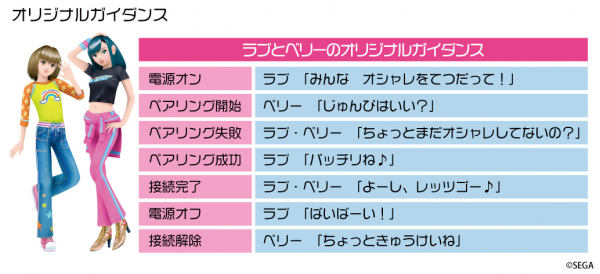 その他豪華仕様の一つとして、ラブ(CV今野宏美)とベリー(CV柳井久代)のオリジナルガイダンスを搭載しており、電源オンやペアリングなど全7種となっております。使用するたびに2人と一緒にいるような感覚が楽しめます。