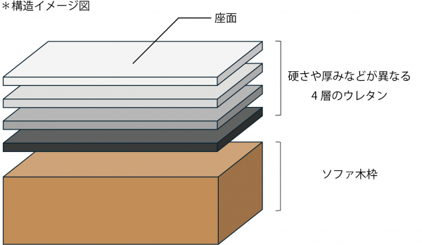 硬さの異なる4種のウレタンを積層することで奥行感のある座り心地を実現しています。木枠をベルト状に張り込んだ伸縮効果により底突き感を軽減し、快適な着座をサポートします。