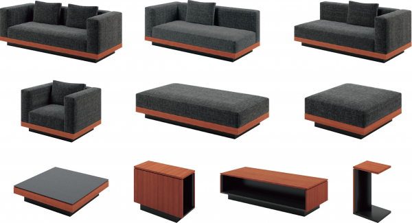 ソファの台輪とテーブルの本体カラーはイタリアンウォルナット色を採用。ソファは2色の布(ブラックとグレー)と1色の革(ブラック)を定番カラーとして展開し、ご相談に応じて別製対応も可能です。布の張地は78%が「RENU(R)(レニュー)」と呼ばれる循環型リサイクルポリエステル素材で構成されたサステナブル素材を採用しており、環境にも配慮した製品です。