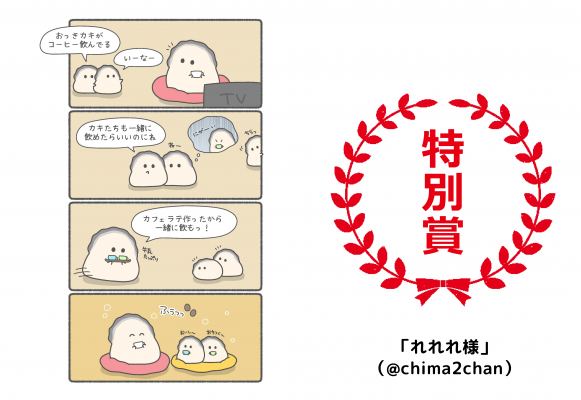 『同じ時間を過ごすカキ』というコメントと共に投稿いただいた作品です。「カキ」というキャラクター性の珍しさや、家族団らんの言葉選びがしっくりとくるようなイラストとなっております。また、初回開催より続けて投稿をしてくださっている点も踏まえまして評価といたしました。