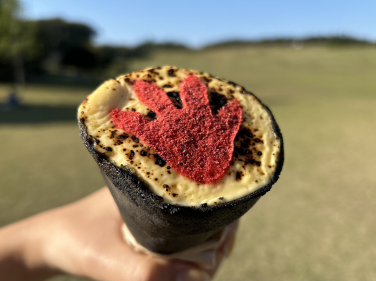 兵庫県立淡路島公園「ニジゲンノモリ」の人気アトラクション「ゴジラ迎撃作戦」内のコラボキッチンカーにて、『ゴジラ足跡付き アイスブリュレクレープ』を11月16日(土)より新発売いたします。