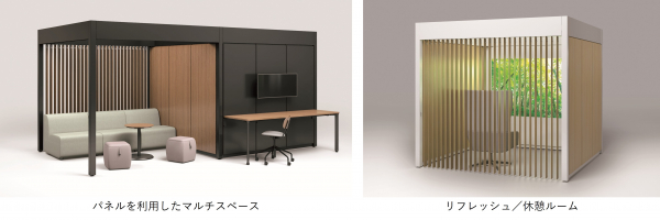 パネルの外側にモニターブラケットやテーブルを取り付けワークスペースを設けたり、壁面を利用してセミクローズドなソファラウンジを設けるなど、効率的に隣接したスペースを活用できます。
