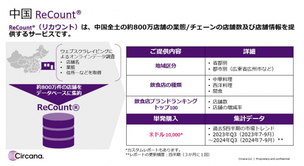 ReCount(R)(リカウント) は、業態およびチェーンの店舗数と店舗情報を提供するサービスです。長年にわたって米国・カナダにおいて信用できる情報を提供してきたReCount(R)が、日本に続き、中国における飲食店舗情報の提供を始めました。