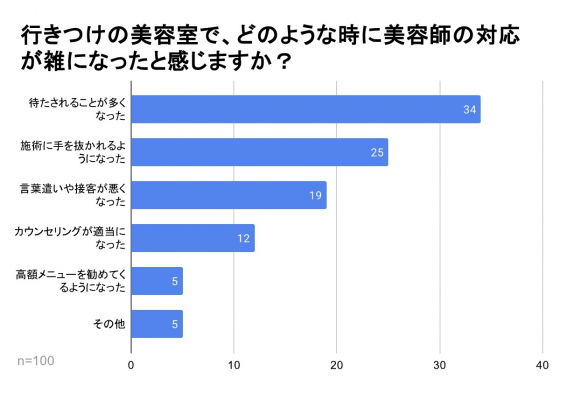 また、「施術に手を抜かれるようになった」と回答した人も25%と多く、顧客は美容師の技術やサービスに期待しているからこそ行きつけにしているのにも関わらず、施術の質が低下することによって手を抜かれたと感じ、信頼を損ねる要因になりやすいと考えられます。