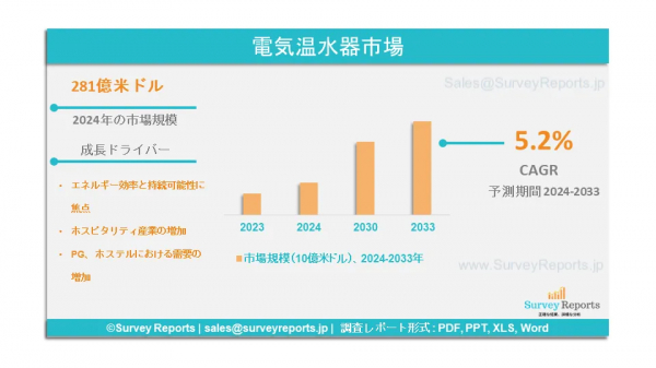 Surveyreportsの専門家は電気温水器市場の調査を分析し、2024年に電気温水器市場規模が275億米ドルに達すると予測した。さらに、電気温水器市場のシェアは、2033年末までに432億米ドルに達すると予測されている。電気温水器市場は、2024年から2033年の予測期間中に、年間平均成長率(CAGR)約5.7%で成長すると予測されている。