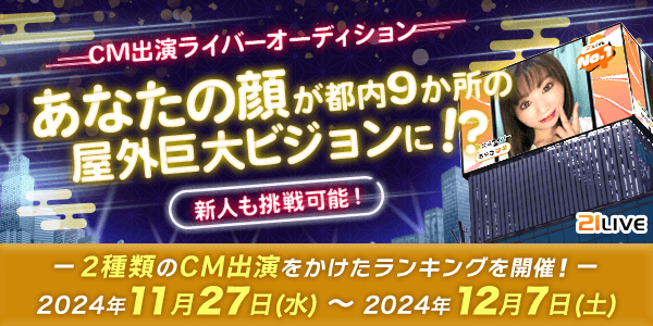 株式会社エムアンドティーティー(本社:沖縄県北谷町、代表取締役:井藤 三知子)が運営するエンターテイメント・ライブ配信アプリ【21LIVE(ニーイチライブ)】URL: https://21.live では、11月27日(水) より「CM出演ライバーオーディション」を開催。東京都内8カ所9面の屋外ビジョンで放映する新CMへの出演権をかけたランキングを行います。