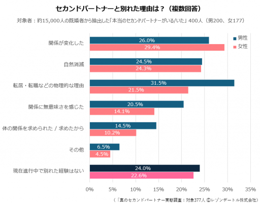 また、「現在進行中で別れた経験はない」という割合が、男性24.5%、女性22.6%もいることも注目です。大勢の既婚者のなかから、セカンドパートナーがいる人/いた人を選び出した結果、ほぼ4人に1人が現在もお付き合い中ということですから、セカンドパートナーという関係の持続性の高さをうかがい知ることができそうです。
