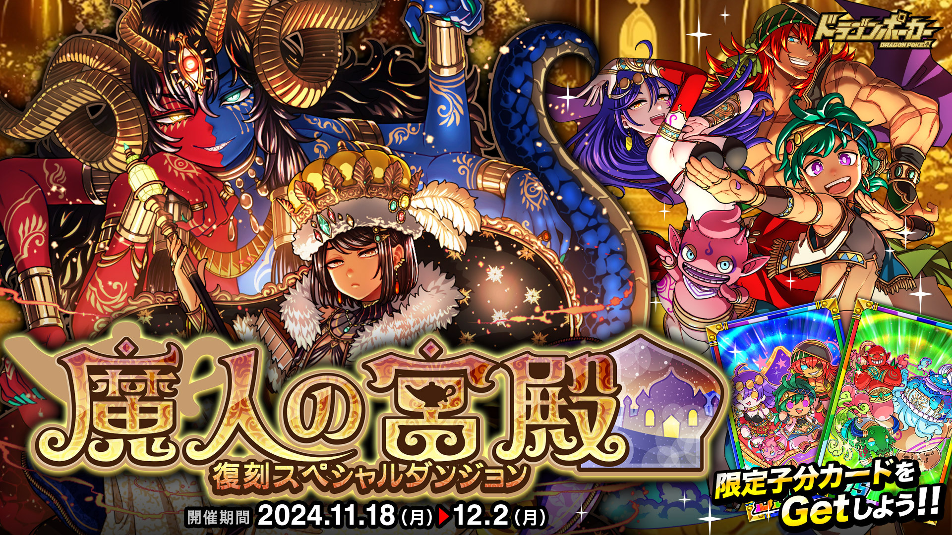 株式会社アソビズム(本社:東京都千代田区、代表取締役:大手智之)は、App Store・Google Playにて好評配信中のリアルタイム合体カードバトル『ドラゴンポーカー』で、2024年11月18日(月)より復刻スペシャルダンジョン「魔人の宮殿」を開催いたします。