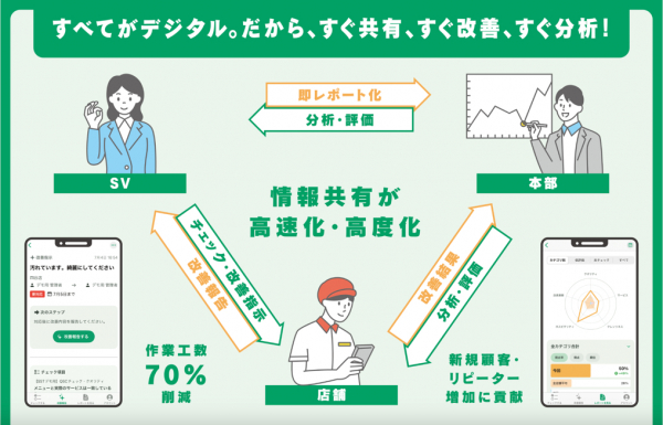 キロクルでは、SV(スーパーバイザー)からQSCチェック時に低評価がついた項目に対して「改善指示」を送付、店長は改善指示に対する改善箇所の写真やコメント等を「改善報告」として返信できます。SVは改善活動の進捗状況をアプリ内で簡単かつリアルタイムに把握することが可能で、改善前後の結果は報告書として本部と即時共有することもできます。
