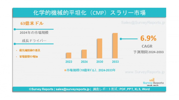 Survey Reports LLCは、2024年11月、化学的機械平坦化(CMP)スラリー市場のタイプ別(装置、消耗品、その他)および用途別(化合物半導体、 集積回路、MEMSおよびNEMS、その他) - グローバル市場分析、動向、機会および予測、2024年から2033年」を発行したと発表した。この調査レポートは、CMPスラリー市場の予測評価を提供している。CMPスラリー市場の成長促進要因、市場機会、課題、脅威など、いくつかの重要な市場力学に焦点を当てている。