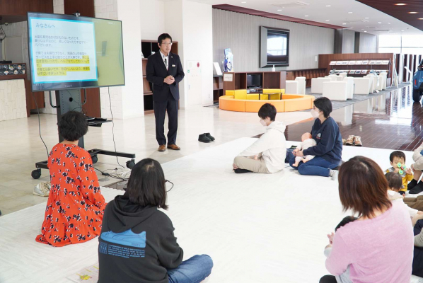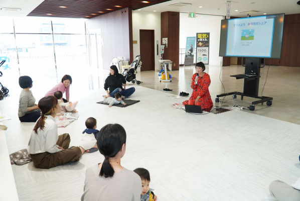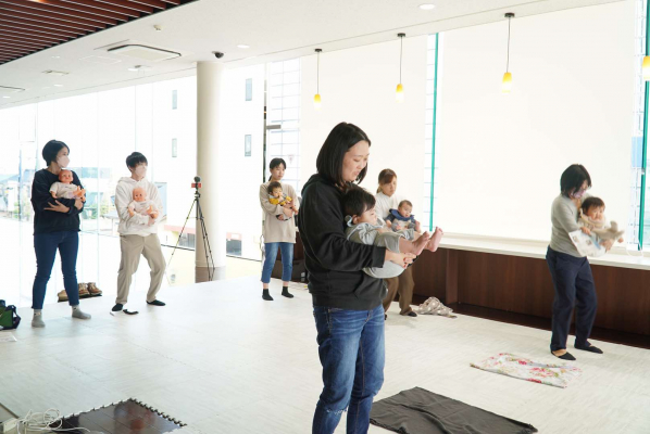 前半は、ベビーヨガ・産前産後ヨガ講師 曳田彩加が赤ちゃんとの遊びやセルフケアを紹介しました。