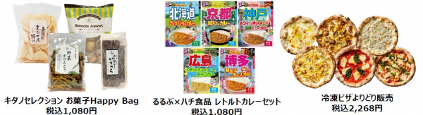 グランドオープンを記念して、お菓子やレトルトカレーのHappy Bagのほか、大山ハムのHappy Bag、冷凍ピザ「PIZZAREVO」3点よりどり販売など、お得な販売企画をご用意しています。旅行雑誌「るるぶ」シリーズのパッケージを模したハチ食品のレトルトカレーは、書店でおなじみのビジュアルにご当地の味が詰まったレトルトカレーが5点セットに。数量限定商品は、無くなり次第順次終了となります。