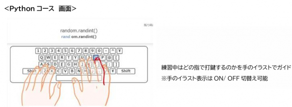 『らっこたん』では新たにPythonの言語でタイピング練習を行う「Pythonコース」を設置しました。プログラミングを行うにはコード入力等を行う必要があるためタイピングスキルは必須です。この「Pythonコース」ではタイピング練習を行いながら基本的なPythonの言語を習得し、プログラミングスキルの基盤を築くことを目指します。また、『らっこたん』では正しい指使いによるタッチタイピングの習得に取り組むことができるので、入力速度と正確性の向上が期待できます。さらに、先生が生徒のタイピングスキルを一括で確認できる管理画面や、保護者向けフィードバック画面も搭載しています。
