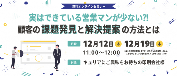 CEO:樋口 清政)は、2024年12月12日(木)/12月19日(木) AM11:00から、印刷業界向けに 実はできている営業マンが少ない?!~顧客の課題発見と解決提案の方法とは~ と題して、セミナーを開催することをお知らせいたします。