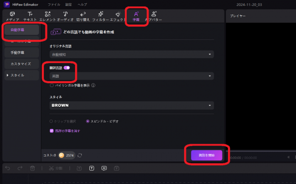 上部メニューの「字幕」タブを選択し、「自動字幕」機能をクリックします。次に翻訳言語をオンにして、翻訳したい言語を選択。動画をインポートして「識別を開始」をクリックすると、AIが動画の音声を解析して自動的に翻訳字幕を生成します。