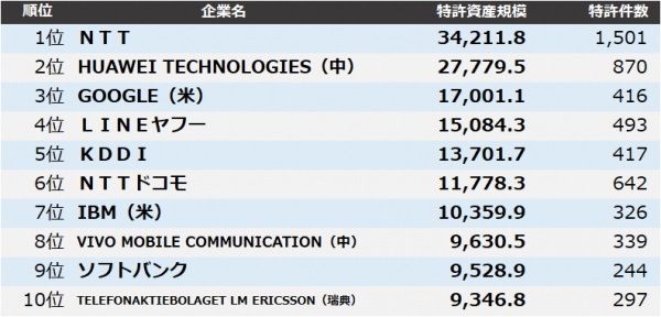 集計の結果、1位 NTT、2位 HUAWEI TECHNOLOGIES(中)、3位 GOOGLE(米)となりました。