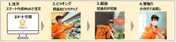 「スマート介護」Webサイト内に新たに開設する「COREIL Fresh」のページから希望の商品を選んで、介護施設のスタッフが注文。15:00までの注文で、近隣スーパーからの配送により、当日中に商品を受け取ることができます。配送時は施設入居者ごとに商品を小分けした状態でお届けをするため、スタッフによる仕分け作業が不要に。また、請求作業はWebから出力できる入居者ごとの購入内訳書を利用することで、業務効率化を図ることができます。