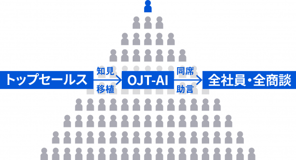 長年にわたり数字づくりを牽引してきたベテランの管理者や優績者がつかんだノウハウを追加で学習した当社開発の「OJT-AI」が成約の確実化を促し、結果として成績不振者の短期底上げや営業未経験者の早期戦力化も成し遂げます。