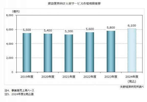 2023年度の建設業界向け人材サービス市場規模※は、事業者売上高ベースで前年度比3.6%増の5,800億円となった。