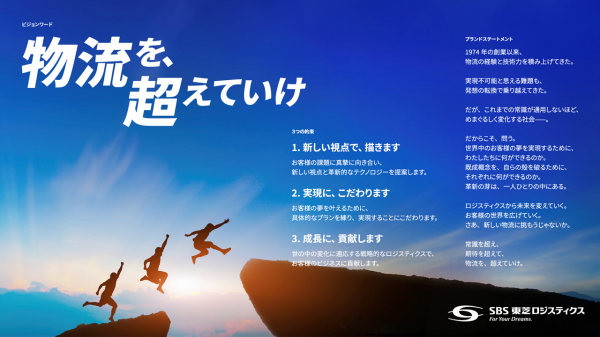 この度策定したブランドビジョン「物流を、超えていけ」には、社員一人ひとりがマインドチェンジを遂げることで、お客様の期待を超える新しいロジスティクスを提供するというSBS東芝ロジスティクスの挑戦への意志が込められています。私たちは、世界中のお客様の夢を実現するために何ができるのかを問い続けることで、既成概念を打ち破り、革新の芽を一人ひとりの中に見出します。そして、ロジスティクスから未来を変えていくことを目指します。