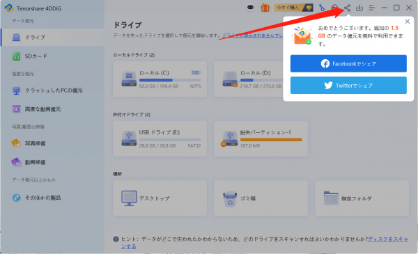 手順1.Tenorshare 4DDiG無料版をインストールします。プログラムが起動後の画面で、右上隅にある「シェア」ボダンをクリックし、FacebookまたはTwitterに拡散して2GBまでデータを無料で復元できます。復元したいデータが存在するドライブやパーティションを選択して、スキャンします。