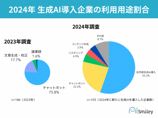 2023年度の調査では、全245社の生成AI導入企業のうち、チャットボット導入企業が141社と圧倒的に多かった一方、2024年は「社内用生成AI導入」が55.3%と利用用途として最も多い結果となりました。