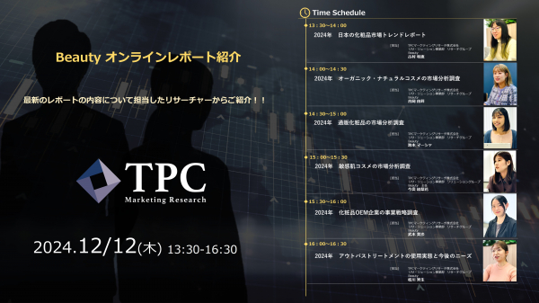 リサ・リューション事業を展開するTPCマーケティングリサーチ株式会社(代表取締役社長:松本 竜馬)は、2024年12月12日にBeautyオンラインレポート紹介を開催いたします。