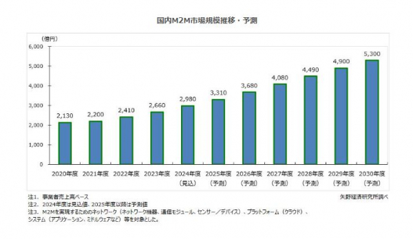国内M2M市場は2025年度以降も引き続き堅調で年率10%前後の伸長を継続し、2030年度は5,300億円に成長すると予測する。