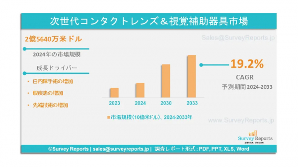 Survey Reports LLCは、2024年11月、次世代コンタクトレンズおよび視覚補綴市場のセグメンテーションに関する調査レポートを発行したと発表した。タイプ別(治療用コンタクトレンズ、薬物溶出コンタクトレンズ )および用途(治療、薬物送達)による市場区分 - 次世代コンタクトレンズおよび視覚補綴市場の予測評価を提供する2024年から2033年の世界市場分析、動向、機会および予測。次世代コンタクトレンズおよび視覚補綴市場の成長促進要因、市場機会、課題、脅威を含むいくつかの主要な市場力学を強調している。