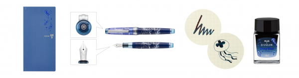 プラスとセーラー万年筆が共同運営している万年筆・文房具ギフトショップ「ancora(アンコーラ)」(https://www.ancora-shop.jp)では、アンコーラ限定バージョンの「海月セット」を数量限定で同時発売します。メーカー希望小売価格(税込)は、38,500円です。