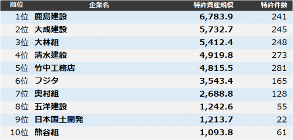 4位 清水建設は、JFEスチールと共同保有の「鉄骨梁付近の大きな開口を有するコンクリート床スラブの変形能力を確保する床スラブ付き鉄骨梁」、5位 竹中工務店は「木質耐火被覆材の脱落を抑制する鉄骨部材の耐火被覆構造」が、注目度の高い特許として挙げられます。