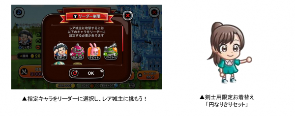 「バトル」から「ひとりで」または「みんなで」を選び、「攻撃」を選択すると、ランダムでレア城主が出現する「レア城主イベント」が開催中。まれに「特別な城」と遭遇し、条件をクリアすると剣士用限定お着替え「円なりきりセット」がもらえます。