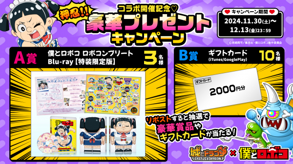 11月30日(土)より、「コラボ開催記念(ハード)押忍!!豪華プレゼントキャンペーン」を実施中。『城とドラゴン』公式X(旧Twitter)の対象ポストをリポストしていただいた方の中から抽選で3名様に「僕とロボコ ロボコンプリートBlu-ray【特装限定版】」を、10名様にギフトカード(iTunes/Google Play)2,000円分をプレゼントいたします。