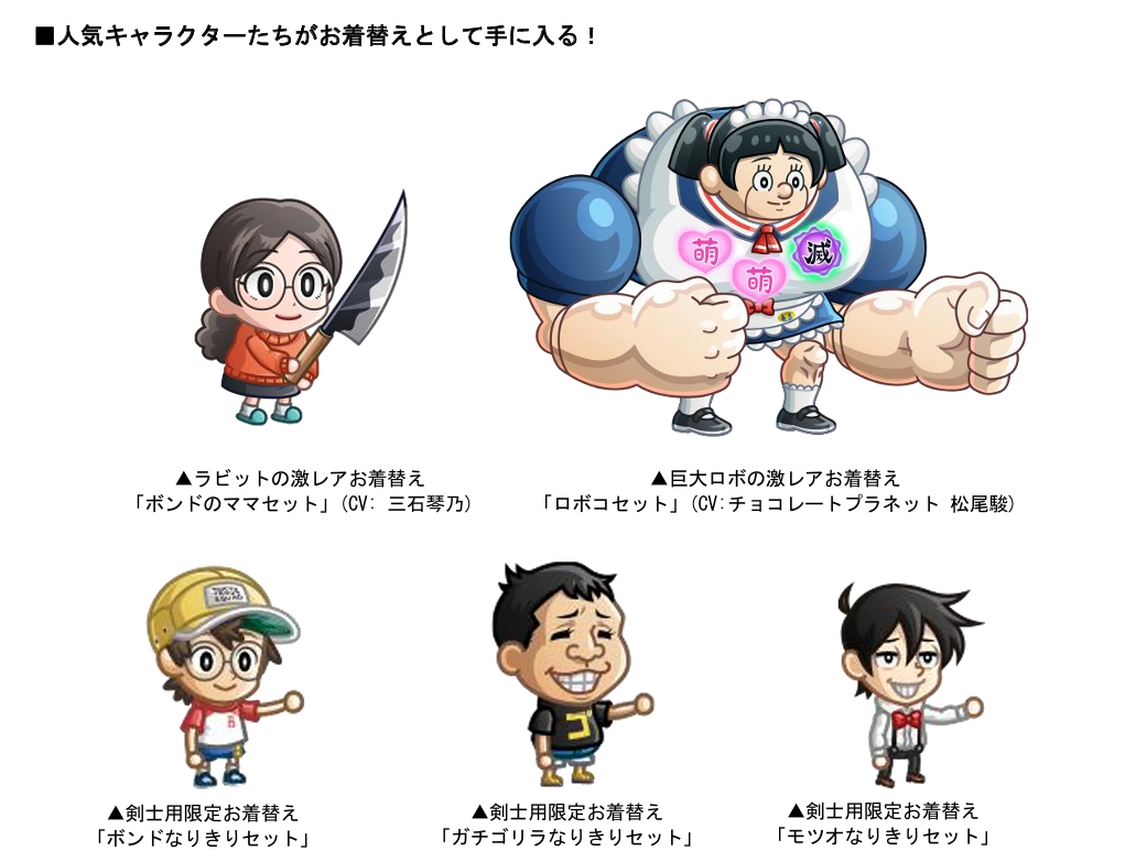 また、ラビットの激レアお着替え「ボンドのママセット(CV: 三石琴乃)」、巨大ロボの激レアお着替え「ロボコセット(CV:チョコレートプラネット 松尾駿)」はボイス付きコラボお着替えとして、剣士用コラボ限定お着替えでは「ボンドなりきりセット」「ガチゴリラなりきりセット」「モツオなりきりセット」も登場。アバたまを割って、コラボ期間中にしか手に入らない限定キャラタマゴやアイテムを手に入れましょう!