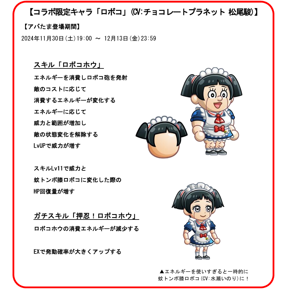 「コラボのアバたま」に限定キャラ「ロボコ(CV:チョコレートプラネット 松尾駿)」が登場し、初回当選でキャラタマゴとして入手できます。以降、当選回数に応じて「制服」「JK」「ナース服」「アイドル衣装」「水着」のお着替えが手に入ります。なお「ロボコ」は、エネルギーを使いすぎると一時的に「蚊トンボ膝ロボコ(CV:水瀬いのり)」に切り替わる仕様!