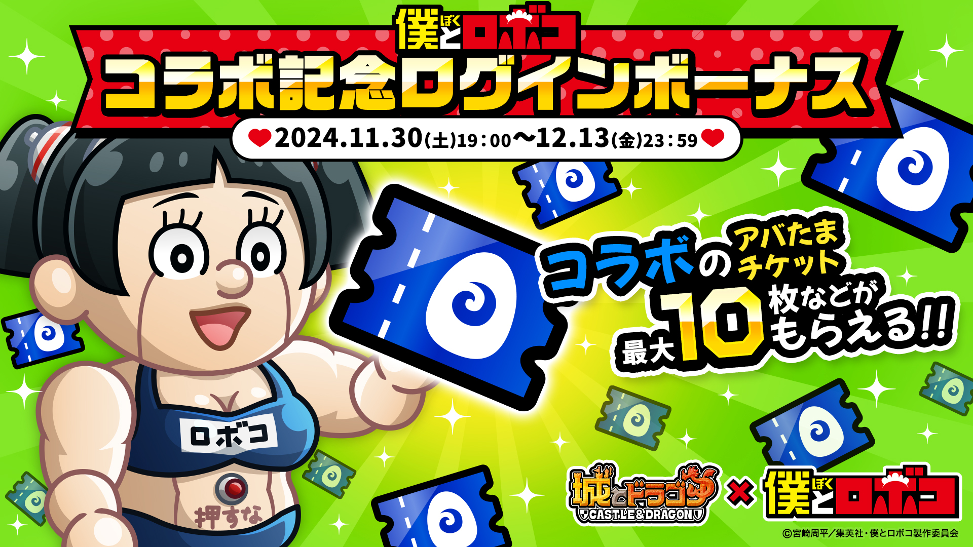 アニメ『僕とロボコ』とのコラボイベント開催を記念して、「コラボのアバたまチケット」最大10枚などがもらえる「ログインボーナス」が開催中。コラボのアバたまチケットを使ってコラボ限定キャラを手に入れましょう!