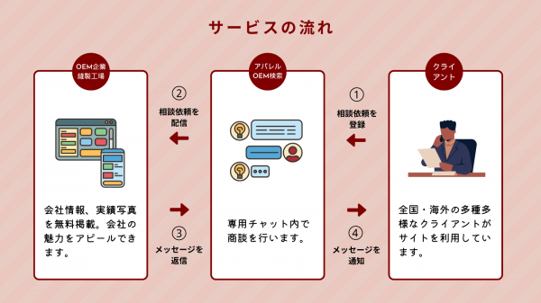 アパレルOEM検索は、国内外のアパレルOEMメーカーや縫製工場と衣服雑貨の製造を依頼したい方を繋ぐマッチングサイトです。