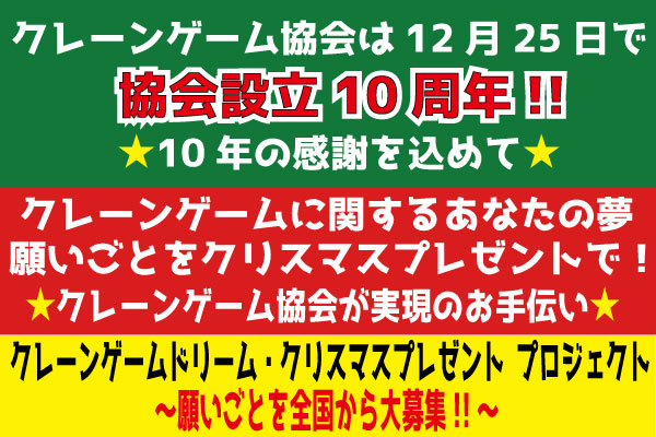 内容:協会設立10周年を記念し、10年間の感謝を込め、日本全国からクレーンゲームに関する夢や願いを募集し、当協会で実現出来る夢や願い、支援可能な夢や願い、叶えてあげたいと共感した夢や願いなどを、クリスマスプレゼントとして提供や実施致します。