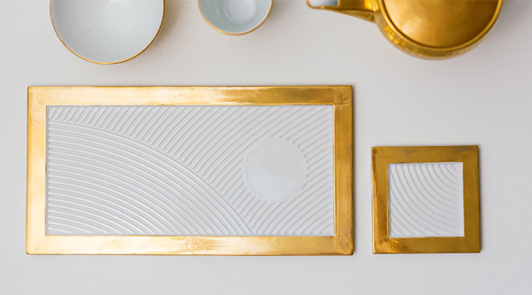 日本の庭園の一つ、枯山水からインスピレーションを受けたデザイン。しのぎのカップと合わせて、カップを置いたり、スイーツをのせて「自分だけの庭」として楽しみます。
