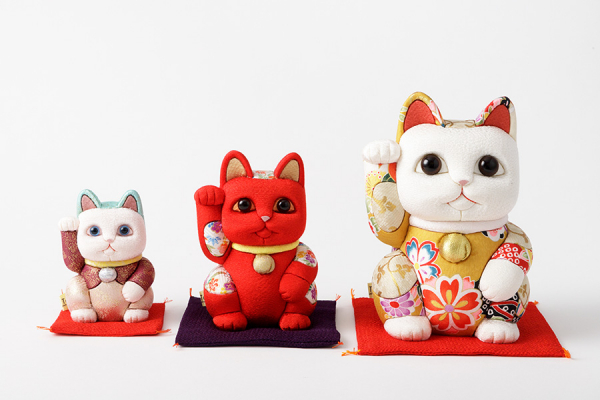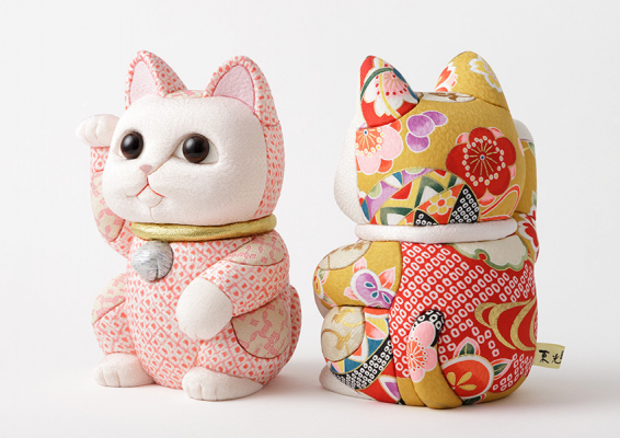 「招き猫」は古来より、開運招福や千客万来、商売繁盛をもたらす縁起の良い置物として、多くの日本人に愛用されてきました。右手を挙げている猫は金運を招き、左手を挙げている猫は人(客)を招くとされています。「風水」シリーズや、スワロフスキーやパワーストーンをあしらい、胴体には絹地のほかプリント布や革など、従来の木目込にはなかった素材を取り入れることにより、招き猫の新しい世界観を展開しています。