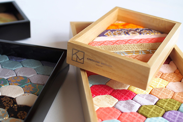多彩な生地を用い、固い木地に目打ちやヘラで布地を隙間に入れ込んでいく、木目込み技術を平面的に用い、クッション性をもたせることで眺めるだけではなく機能性をもつデラックスなトレイを製作しました。枠には会津塗りを施し、艶やかな質感をプラス。色の構成や、縁起のいい亀甲文様、西陣織などを取り入れ、繊細さと豪華さを表現しています。