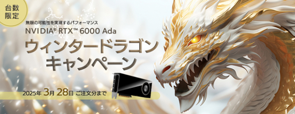 2024年初頭に第1弾となる「ドラゴンブーストキャンペーン」として開催し、多くの反響をいただきました。第2弾を経て、この度第3弾となる「ウィンタードラゴンキャンペーン」を開催し、引き続きNVIDIA(R) RTX(TM) 6000 Adaを活用して大規模なデータを使用する研究や分析、複雑な処理を行う動画編集や3Dレンダリング、機械学習などの用途で研究開発を加速したいお客様を支援させていただきます。