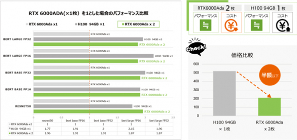 NVIDIA(R) RTX(TM) 6000 Adaのリテールプライスは税別約110万円(2枚で220万円)、アカデミックやインセプションパートナー向けの特別価格が1枚税別約90万円(2枚で180万円)ほどとなっています。これに対してNVIDIA H100は1枚約500万円の価格設定となりますので、RTX 6000 AdaはAI学習においても非常にコストパフォーマンスの高い製品という結果となりました。