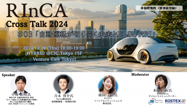 科学技術振興機構 社会技術研究開発センター (JST-RISTEX) の「科学技術の倫理的・法制度的・社会的課題 (ELSI) への包括的実践研究開発プログラム」(RInCA)は、下記の通り、RInCAクロストーク2024 #03「自動運転が切り開く未来とELSI/RRI」を開催します。