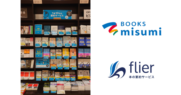 累計会員数120万人を突破した本の要約サービス「flier」を運営する株式会社フライヤー(本社:東京都千代田区、代表取締役CEO 大賀康史)は、鹿児島県を中心に書店を展開している株式会社Misumi(本社:鹿児島県鹿児島市、代表取締役グループCEO 岡 恒憲)と業務提携を実施し、九州最大級の書店・ブックスミスミ オプシアにて「flier」フェアを12月1日(日)から1月31日(金)まで実施することをお知らせします。今後は展開書籍を定期的に入れ替えながら、継続的に棚を展開していき、フェア展開店舗数の拡大を想定しています。